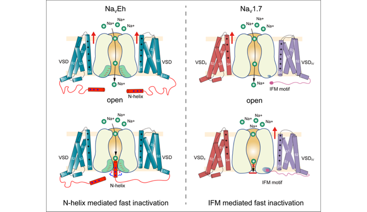 高等动物的钠通道通常会在几毫秒内快速失活。目前真核钠通道结构研究表明,一个保守的IFM基序作为一个疏水性闩锁,以变构方式关闭激活门。相比之下,同源四聚体原核钠通道缺乏IFM基序,也没有快失活机制,而是具有数百毫秒内的缓慢失活。从进化的角度来看,在原核钠通道的慢失活和真核钠通道的快失活之间缺失了一环。