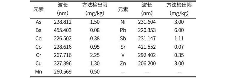 使用样品空白溶液测定10次, 软件自动计算仪器检出限,各元素方法检出限在0.08-6.00mg/kg之间,满足标准要求。