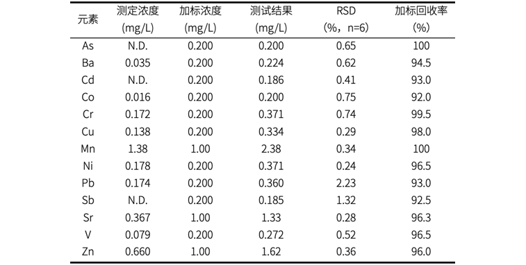 对样品进行加标实验,加标回收率在92.0-100%之间,准确度高。样品6次重复性测试,RSD值小于2.50%,精密度好。