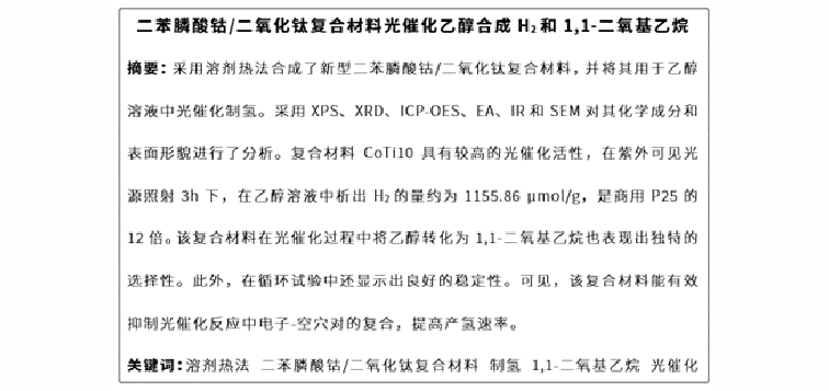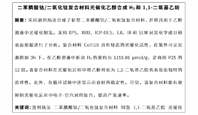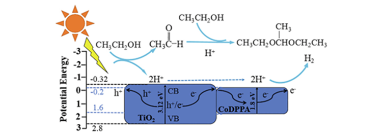 进一步结合XPS-VB与紫外可见吸收得到的带隙对复合催化剂在催化过程中的电子转移进行机理阐述,较于TiO2,CoDPPA具有更窄的带隙,在紫外-可见光照射下,电子从TiO2的价带激发到导带,由于Co2+/Co+的氧化还原电势(-0.43 V vs SHE)低于TiO2的导带能级(约-0.6 V),因此TiO2导带中的光生电子可以是有效地转移到CoDPPA,进而抑制光生电子与空穴的复合,提升光催化活性。该复合材料作为光催化剂在乙醇的光催化转化中具有重要的应用价值。