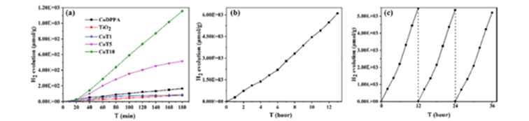 自1972年Fujishima和Honda发现TiO2能在紫外光下分解水以来,它受到了广泛的关注,被认为是最有潜力的产氢半导体光催化剂之一。由于TiO2具有独特的化学稳定性、可用性、高反应性、低成本、无毒无害安全等特点,已广泛应用于p型透明导体、锂离子微电池、自洁防污中。然而,由于光生电子-空穴对的快速重组和宽带隙,TiO2的光催化活性受到一定程度的限制。作者制备的不同CoDPPA/二氧化钛配比的复合材料,光催化析氢实验在密闭的抽气循环系统中进行,光源选用300 W氙灯。用气相色谱仪和TCD检测器定期分析气体产物(光催化析氢量见图3a和b,光催化析氢循环见图3c)。