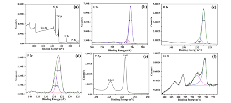 采用XPS进行了元素和化学状态分析。CoTi10的数据表明,该复合材料含有C、O、P、Co和Ti元素。在Ti的精细谱中(图6e),两个结合能为458.8 eV和464.7 eV的峰分配给Ti 2p3/2和Ti 2p1/2,Ti 2p3/2和Ti 2p1/2之间的自旋能分离为5.9 eV,表明Ti离子在复合材料中处于4+氧化态。在Co的精细谱中(图6f), Co2p3/2和Co2p1/2的拟合峰分别在780.9 eV和796.3 eV,与CoDPPA的精细谱相比,Co的拟合峰位置发生了移位,这可能是CoDPPA与TiO2相互作用造成的。两个峰之间的自旋轨道分离能为15.4 eV,表明复合材料表面Co元素以Co2+的形式存在。