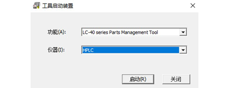 2、在功能(A)中选择LC-40 series Parts Management Tool,仪器(I)中选择我们在Labsolutions软件中所建立的仪器,点击启动。