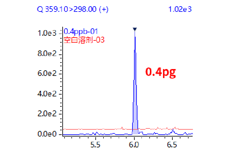 空白溶剂(红色)和0.4 ng/mL(蓝色)马兜铃酸Ⅰ的MRM色谱图
