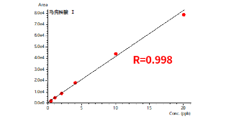 马兜铃酸Ⅰ在0.4-20 ng/mL浓度范围内,线性和重现性均良好,结果如下图所示。