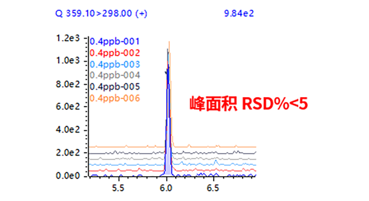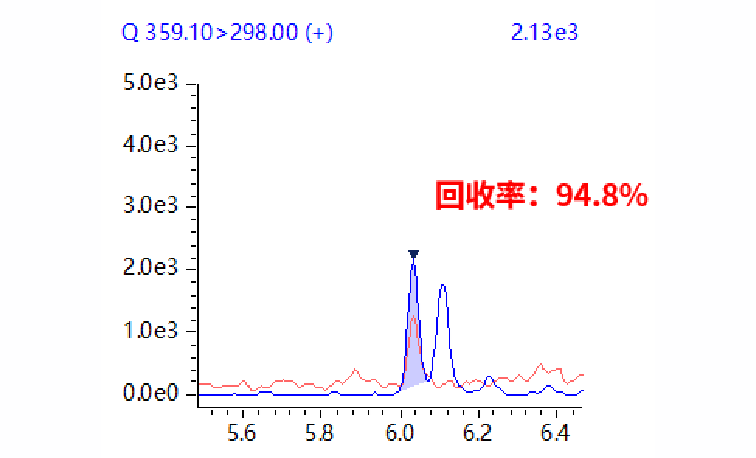 加标样色谱图(红色为定性离子,蓝色为定量离子)
