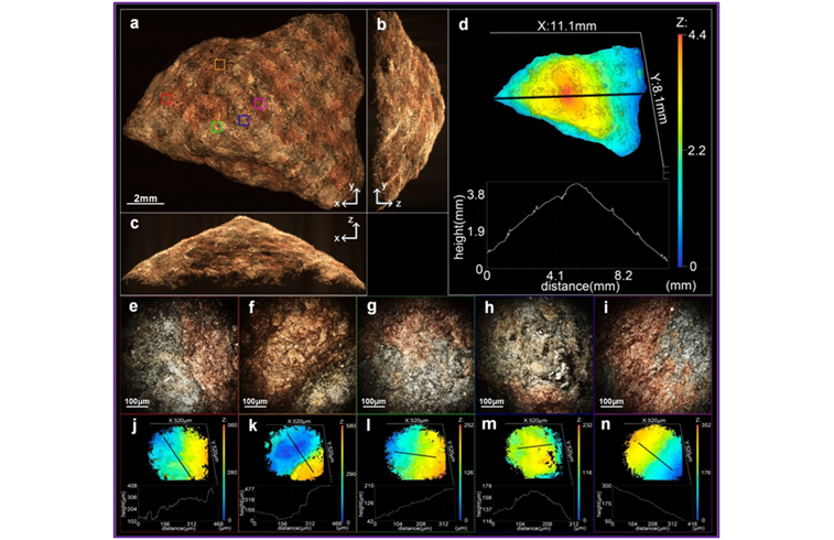图1. 月球陨石NWA 11474的彩色光切片三维成像结果。(a)-(c)上视图、左视图和正视图;(d)三维形貌分布和沿直线处的高度曲线;(e)-(n)局部放大图及其三维形貌分布。