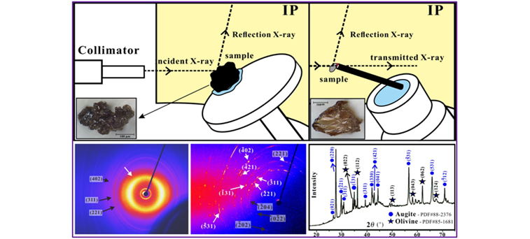 原位微区X射线衍射技术(In-situ Micro-XRD)具有无损、准确、制样灵活和空间分辨率高等优点,非常适合珍贵地外样品(如月壤)的分析研究。现有对于月球陨石、阿波罗样品的研究和月球模拟场计算均表明,非晶态物质是月球表层土壤的重要组成部分。月壤中玻璃组分的成因及分布,对深入了解和认识月球的起源和演化、月表太阳风和微陨石轰击等作用具有重要意义。但其粒径细小、来源多样以及共生关系复杂等特点,目前仍没有很好的手段和方法可对其进行系统地研究。在《In-situ Micro-XRD Methods for Identifying Glass and Minerals in Extraterrestrial Samples(原位微区XRD鉴定地外样品中玻璃和矿物)》一文中,中国科学院广州地球化学研究所马灵涯团队基于Rigaku D/MAX RAPID-V微区衍射技术对包括月壤样品集合体、似单晶颗粒及制靶样品在内的多种形态的月壤样品(No. CE5C0000YJYX023 和 No. CE5C0000YJYX125)进行了原位分析,探究不同类型样品最佳的制样和测试方法(图3),并对大量测试结果进行归类分析和总结。发现在嫦娥五号月壤中非晶物质与辉石、长石等矿物广泛共生,且玻璃质以覆层或基质的形式充填于矿物碎屑之间。作者认为月壤样品中的玻璃可能是在月球经历的频繁和强烈的撞击事件中,由冲击变质熔融或蒸发沉积等过程产生。上述研究表明样品颗粒不同的有序度和玻璃含量,可作为推断撞击中心或火山喷发中心的证据之一。
