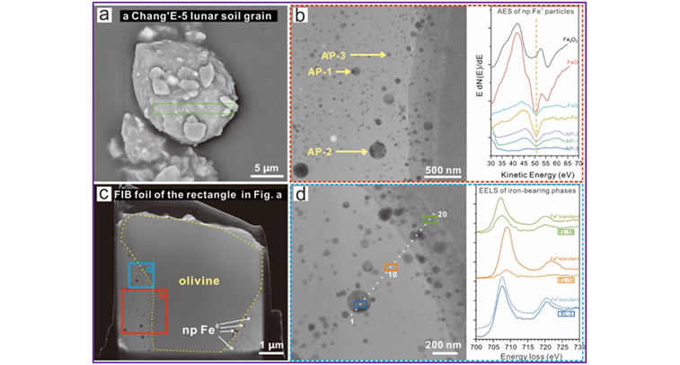图6. 应用FIB、AES和TEM-EELS联合技术原位测定嫦娥五号月球土壤中含铁相的价态。a. 月壤颗粒的聚焦离子束(FIB)制样位置;b. np-Fe0的俄歇电子能谱图;c. FIB超薄片的扫描透射明场电子图像 ;d. 月壤颗粒中不同含铁相的电子能量损失谱图
