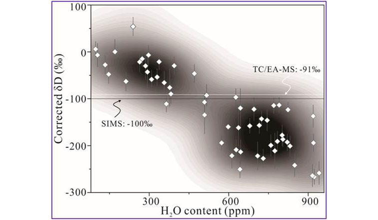 大型二次离子质谱(LG-SIMS)具有微米级高空间分辨率(~1 μm)、近无损剥蚀和高的质量分辨率(可达4万)等优越性能,被誉为微区地球化学分析界的“核武器”。二十年来中国的LG-SIMS分析技术发展迅速,在含U-Th矿物定年、稳定同位素及低含量挥发份等方面均达到了世界同类实验室的先进水平。在《SIMS Zircon Hydrogen Isotope And HO Content Analyses And Reference Material Development(二次离子质谱测定锆石氢同位素组成和水含量及标准物质开发)》一文中,中国科学院广州地球化学研究所夏小平团队报道了新开发的SIMS超低背景下锆石氢同位素和水含量同时测定技术,并新研制成功的国际上第一套锆石氢同位素参考物质(D15395和D15814)(图8)。该技术为研究地外样品的挥发份,尤其是水的含量和来源提供了新的研究手段。