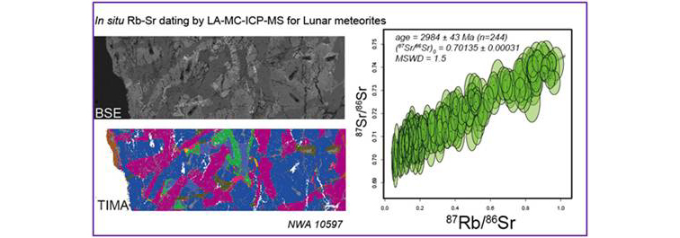 月球样品形成年龄(包括月球陨石和太空任务期间收集的月球样本)对确定地月系统的演化历史至关重要。采用微区分析技术测定富U矿物相(如斜锆石或磷灰石等)的U-Pb年龄是目前获得月球或其他地外样品年龄的主要手段,但大多数陨石样品是超镁铁质或镁铁质成分,富U矿物相在样品中稀少且微小。而地外样品中主要矿物相,如斜长石、辉石、钛铁矿或玻璃质等则可以考虑利用Rb-Sr放射性衰变体系获取其Rb-Sr等时线年龄。在In Situ Rb-Sr Dating Of Lunar Meteorites Using Laser Ablation MC-ICP-MS(激光剥蚀MC-ICP-MS原位Rb-Sr定年分析月球陨石样品)》一文中,中国地质大学(武汉)张文和胡兆初团队系统地研究了LA-MC-ICP-MS微区原位Rb-Sr测年技术用于月球陨石定年的可行性(图7)。实验结果表明斜长石、辉石、钛铁矿或玻璃质等主要矿物具有含量低且变化大的87Rb/86Sr比值,在古老陨石样品中(>1Ga)可以积累一定的放射性成因87Sr。所开发的LA-MC-ICP-MS技术可准确地识别出由87Rb衰变引起的87Sr/86Sr变化,并结合本课题组开发的数据处理技术(Iso-Compass)建立了样品剥蚀区域内87Rb/86Sr与87Sr/86Sr的线性关系,实现了低Rb/Sr样品的微区原位Rb-Sr等时线年龄测定。该方法应用于两块不同岩性的月球陨石(玄武质陨石NWA 10597和橄榄辉长岩NWA 6950)中的斜长石、辉石、钛铁矿和玻璃等矿物相年龄测定,所获得Rb-Sr等时线年龄(2984 ± 43 Ma for NWA 10597 和3149 ± 20 Ma for NWA 6950)与文献报道采用SIMS使用其他放射性测年体系的结果(2990-3032 Ma for NWA 10597 and 3210-3187 Ma for NWA 6950)相一致。该技术可为未来开展地外天体样品年代学研究提供新的技术手段。