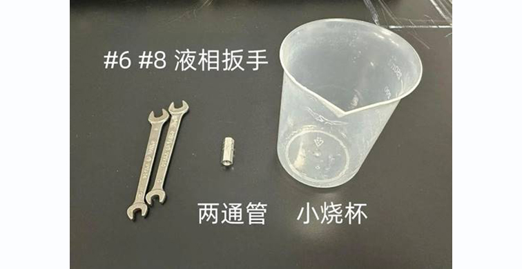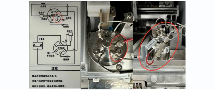 根据机身上的高压阀流路图,在高压阀组件上找到#1号位接头(Sample Loop样品环接头)和#6号位接头(Pump In送液泵入口接头),将两个接头用液相扳手#6拧下,并用两通管将这两个接头连接。