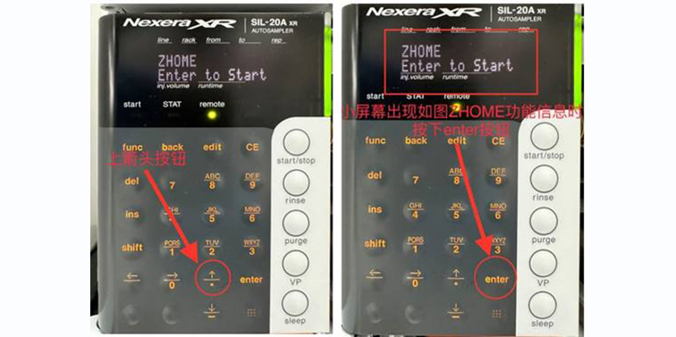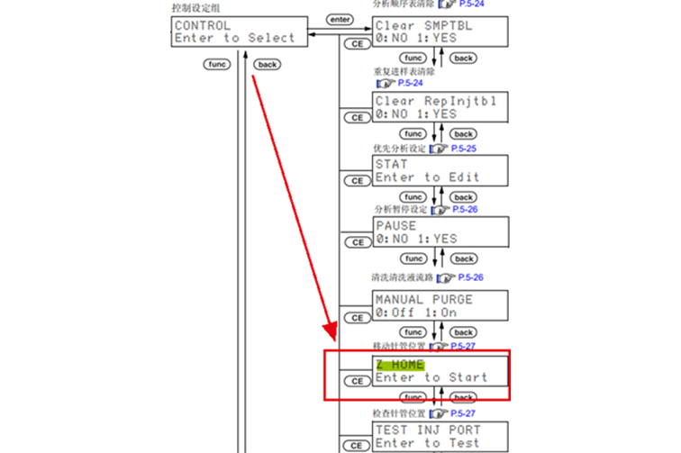 在进样器屏幕的初始界面下按↑键一次,界面会出现[ZHOME Enter to Start]信息显示。随后再按下enter键一次。设备将自动把进样针调整到中间的Z-HOME位置,令进样针处于悬空状态(该功能亦可在Control控制设置组中找到,详见如下说明书手册截图)。