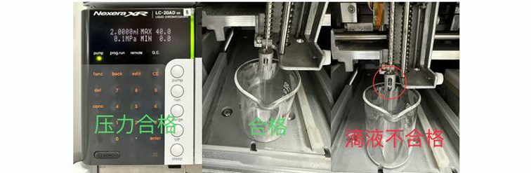 状态不合格的进样针出液时,会出现液柱偏斜或无法形成连续型液柱,可能伴随输液泵压力反馈高等情况。