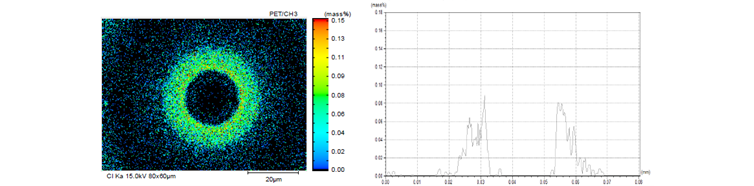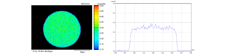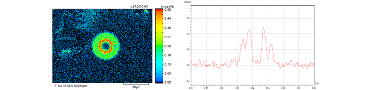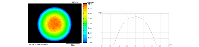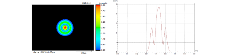 岛津研发部门使用EPMA-8050G仪器分别对单模和多模光纤进行线、面分析测试。从单根光纤试样的横截面的元素线分布和面分布的测试结果可以观察掺杂元素的含量及扩散分布情况。