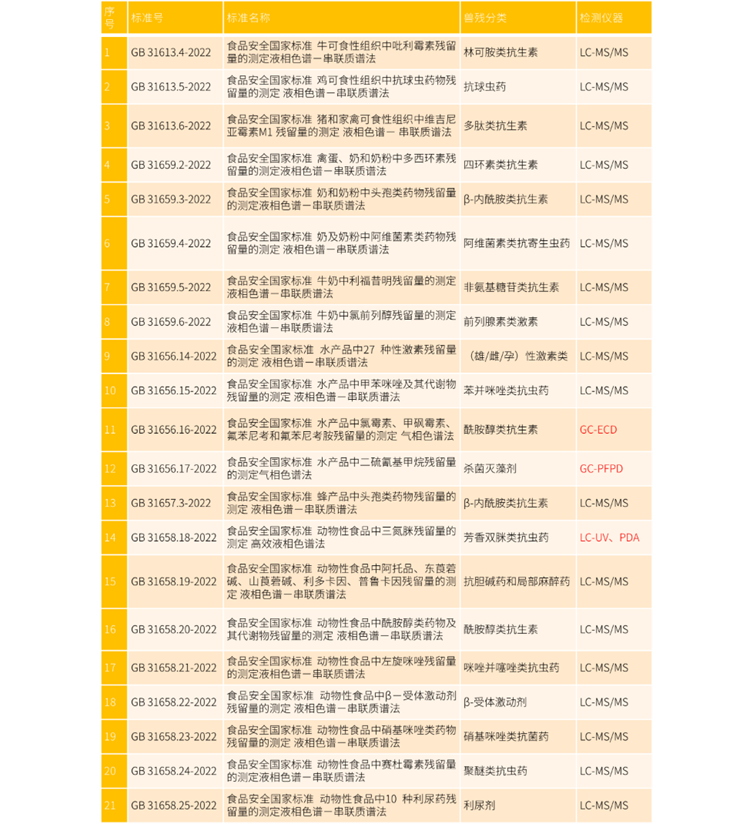 对于此次发布的标准,小编整理了21项标准检测方法中兽药的类型以及使用的仪器。
