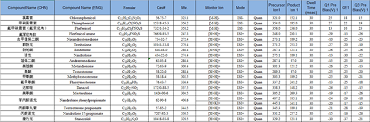 岛津最新的兽药分析方法包包含30多类570余种兽药化合物,涵盖国家标准、行业标准、农业部公告等多个标准涉及的兽药。方法包中既包括中英文名称、分子式、质量数、CAS号、MRM参数等化合物信息,也有按类别划分的所有兽药化合物的独立方法,用户可根据实际分析需求直接查找化合物参数或调用方法,灵活多变地快速实现多组分同时分析。