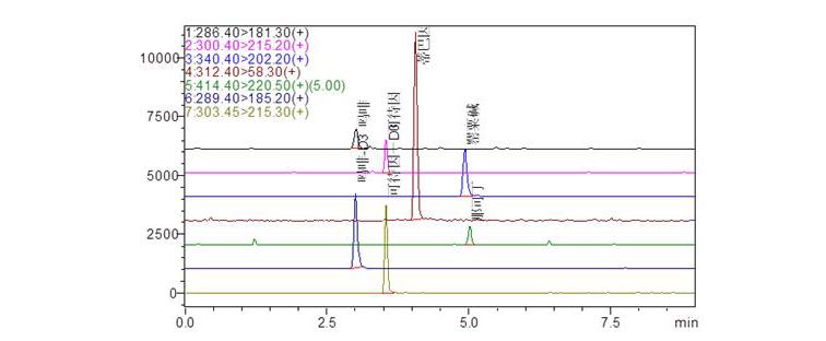 使用岛津液相色谱与三重四极杆联用系统,采用MRM模式,有效排除基质干扰,10min内即可快速确证火锅食品中是否添加罂粟壳。
