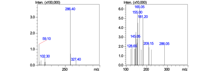 吗啡的一级质谱图(左图)和产物离子质谱扫描图(CE值为-40V)(右图)