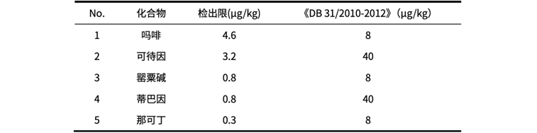 按照3倍信噪比作为检出限,五种目标分析物检出限范围在0.3~4.6 μg/kg之间,方法灵敏度优于上海市地方标准《DB 31/2010-2012 火锅食品中罂粟碱、吗啡、那可丁、可待因和蒂巴因的测定 液相色谱-串联质谱法》规定的限值。