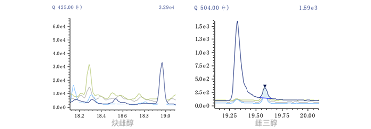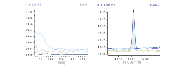 取市售的猪肝样品,分析检测结果如下图所示,样品中检测出17β-雌二醇和雌三醇残留。