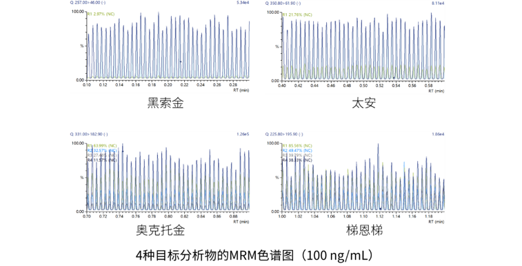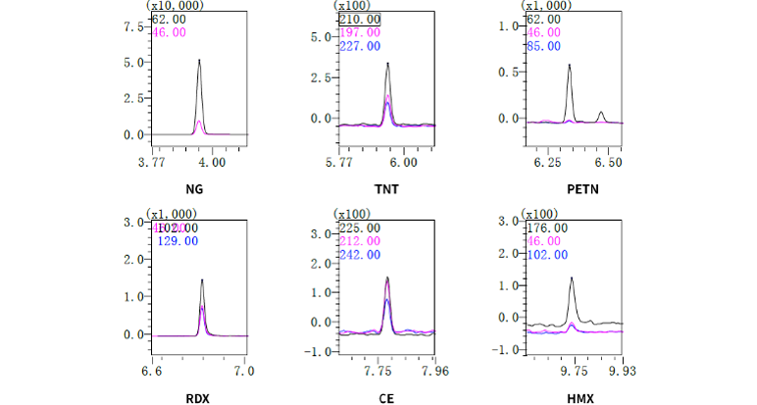 DPiMS-8060可在1min完成四种爆炸物的分析检测。本实验分别针对标准溶液和基质匹配溶液进行重复性测试,结果表明该方法重复性良好。在LabSolutions Insight软件中使用MSn谱库搜索功能,对爆炸残留物中4种爆炸物进行定性筛查,结果显示目标物匹配度良好。本方法具有方法简便、分析速度快、重复性好的特点,为土壤中爆炸物的快速筛查打开了一个新的窗口。