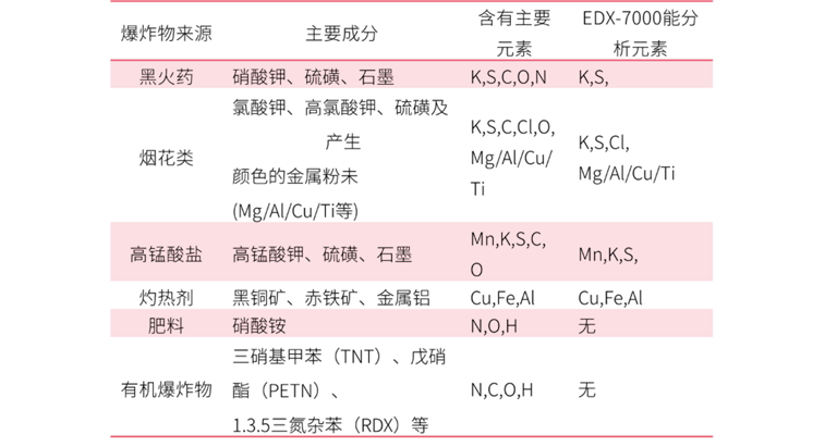 根据各类爆炸物的主量元素不同,通过X射线荧光的定性-定量分析即可初步筛查为何种爆炸物,这为公安司法机关的快速查明爆炸物的来源提高了效率。