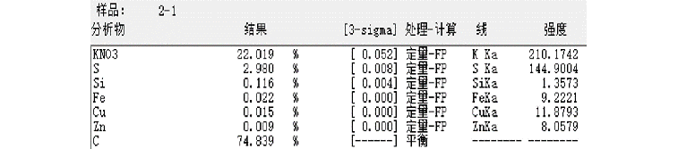 根据爆炸物定性主要元素进行爆炸物来源的初步判定程序得出,上述样品定性-定量结果中主要元素为S/K,无高Cl, 无高Mn,无高Al/Cu/Fe,故样品判定为黑火药类爆炸物。进行以C(炭)作平衡、K以KNO3的形式表示的数据重新处理后,硝酸钾、硫磺、石墨的比例也接近实际黑火药的比例,数据处理后结果如下图。