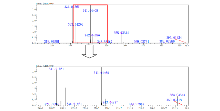 为RT4.72的一级质谱图及放大图。对RT4.72进行高分辨质谱解析,m/z331.0156与 m/z333.0120满足3:1的关系,推测其为[M+Cl]-。利用岛津LCMS-9030高质量精度的特点,内标法质量轴准确度小于1 ppm/hr。