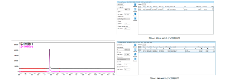 使用FormulaPredictor软件预测其分子式,设置C、H、O、N、Cl各元素最大数目分别为:150、300、12、10、1。m/z331.0156预测结构。得到唯一可能的分子式为C4H8N8O8,质量数偏差-0.90ppm。为m/z331.0156与m/z341.0447 的提取离子流图,图中显示两者均有相同的出峰时间,极有可能指向同一个化合物。对m/z341.0447进行预测。综合判定其为[M+HCOO]-, 质量数偏差-0.11ppm,在预测列表中排名第一。