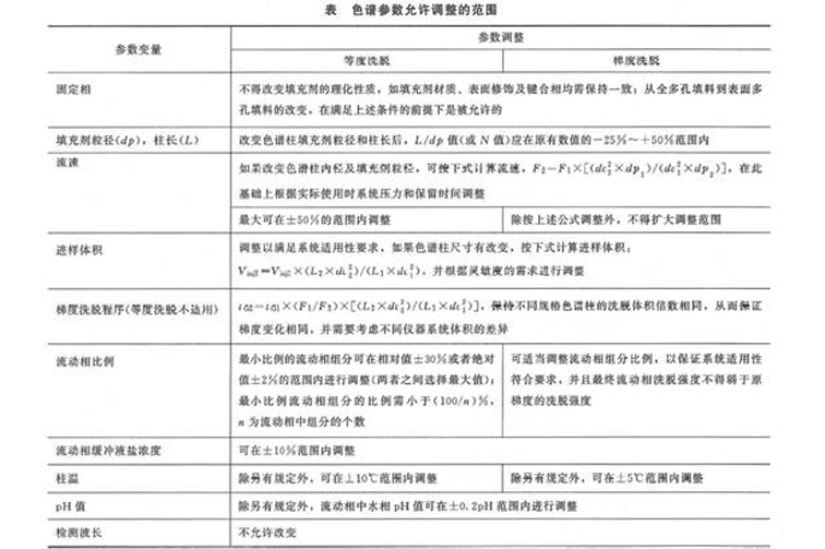 2015年版《中国药典》0512通则规定:品种正文项下规定的色谱条件(参数),除填充剂种类、流动相组分、检测器类型不得改变外,其余如色谱柱内径与长度、填充剂粒径、流动相流速、流动相组分比例、柱温、进样量、检测器灵敏度等可适当调整。