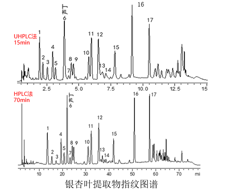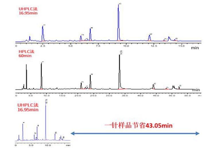 转换成UHPLC法后,分析效率提升至原来的3倍以上。转换成UHPLC法后,特征峰顺序、数量、RRT、相对峰面积均符合标准规定。