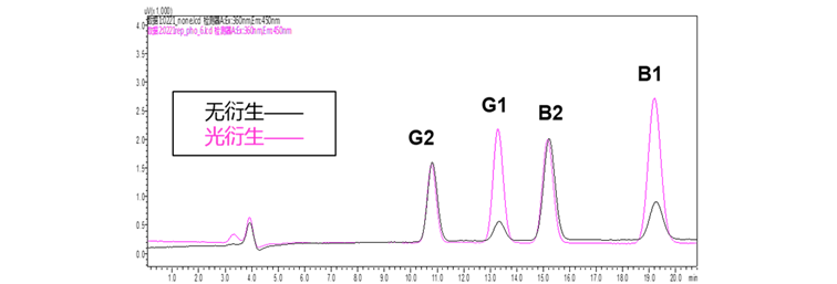 经色谱柱分离后的黄曲霉毒素,在PR-1000中进行光化学反应,并被荧光检测器检测,其黄曲霉毒素B1和G1的荧光信号强度明显增强,检测灵敏度显著提升,同时维持了优异的峰形。