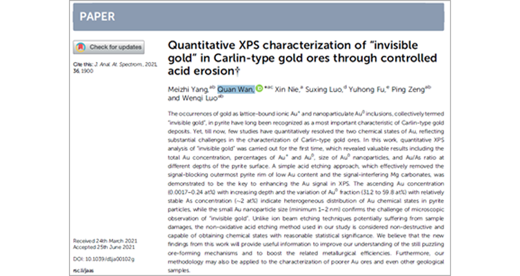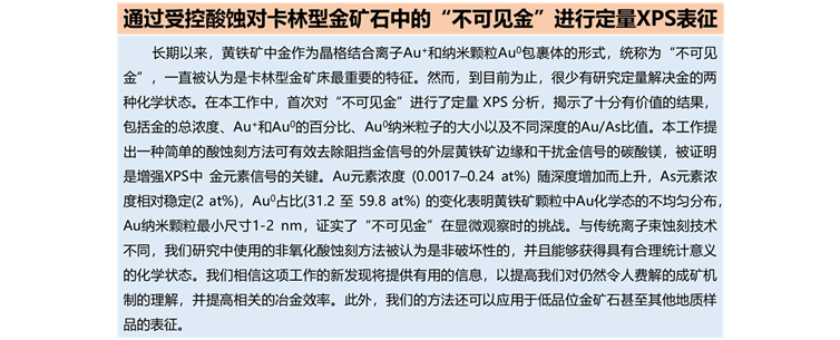 卡林型金矿(Carlin-type gold deposit),于20世纪60年代初期在美国西部内华达州的卡林镇被发现,从而得名,其显著特征是金在载金矿物(主要为含砷黄铁矿)中常以晶格金(Au+)和纳米级包体金(Au0)的形式赋存,因金无法直接通过光学显微镜观察而被称为“不可见金”。“不可见金”赋存状态的研究对卡林型金矿的选冶及其微观成因机制有重要的指示意义,然而“不可见金”的定量表征仍然存在较大难点。中国科学院地球化学研究所万泉研究员及其团队采用逐级酸蚀与XPS分析相结合的手段建立了卡林型金矿中金赋存状态的定量表征方法,首次通过XPS分析成功获得了“不可见金”的量化分布规律,相关研究成果以封面文章形式发表于《Journal of Analytical Atomic Spectrometry》期刊。