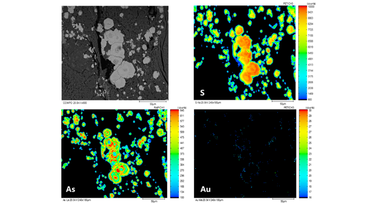 黄铁矿表面通常覆有厚达几百纳米的贫金层(该层主要为FeS2),通过EPMA(电子探针)测试可得到S、As、Au元素分布,如图4,可见Au含量较低且主要存在于黄铁矿中贫金层下的富As区域。