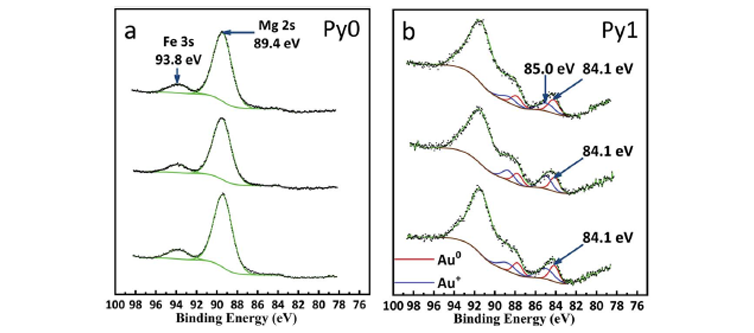 地质矿产领域中,黄铁矿中Au化学状态的研究对卡林型金矿的选冶及其微观成因机制有重要的指示意义。一般情况下,表面贫金层厚度远大于XPS的检测深度(~10 nm),且其中金含量远低于XPS的元素检出限(~0.1 at%),因此直接测试几乎得不到有效的Au信号,无法进行价态分析。中科院地化所矿床室万泉研究员及其团队以贵州贞丰水银洞金矿样品为例,采用非氧化性酸简单有效地去除了屏蔽XPS金信号的贫金层(位于含砷黄铁矿最外层)以及干扰XPS金信号的含镁矿物(如白云石),首次采用XPS获得了“不可见金”的一系列重要定量数据。