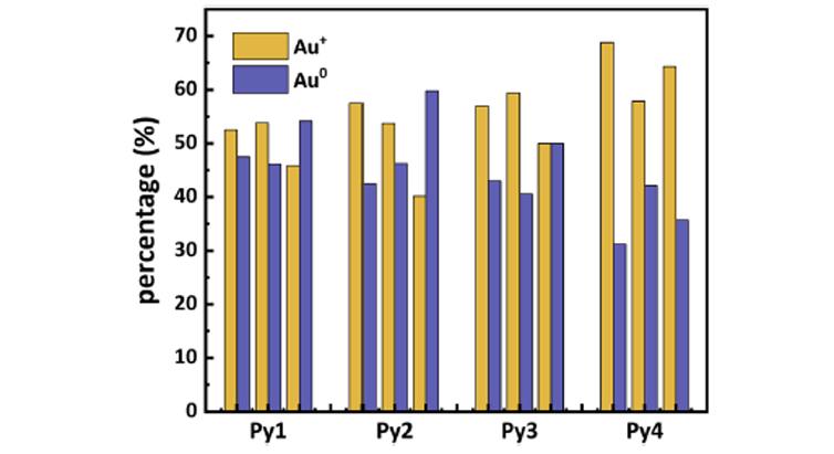 图6. 利用 Py1-Py4的Au 4f XPS光谱分峰拟合估算的Au+和Au0的百分占比
