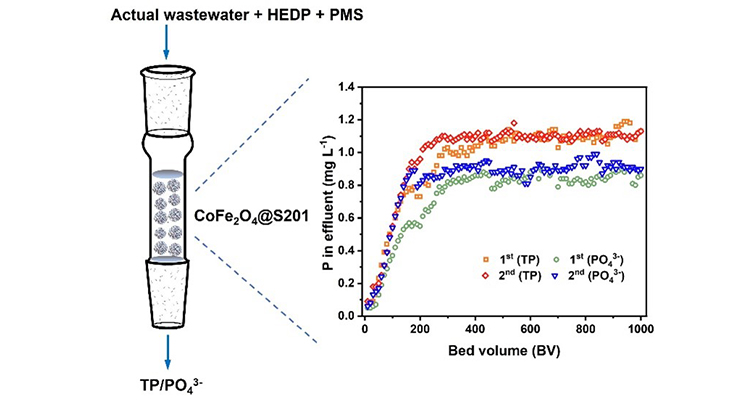 此次研究中,朱敬林等提出了将树脂负载铁酸钴材料用于非自由基为主导的体系下,通过活化过一硫酸盐降解有机磷酸,并在连续流实验中考察材料的催化性能和稳定性能。