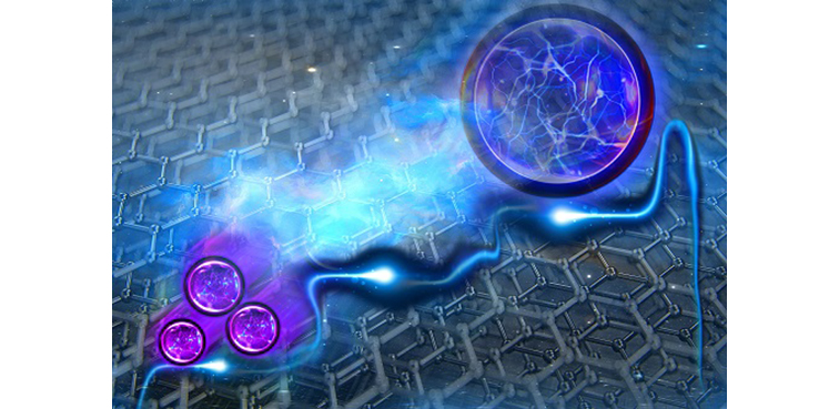 分数量子霍尔效应通常在非常高的磁场下出现,但麻省理工学院的物理学家现在在简单的石墨烯中观察到了它。在5层石墨烯/六方氮化硼 (hBN) 莫尔超晶格中,电子(蓝球)彼此强烈相互作用,并且表现得好像它们被分解成分数电荷一样。图片来源:桑普森·威尔科克斯。美国科学促进会优瑞科网站