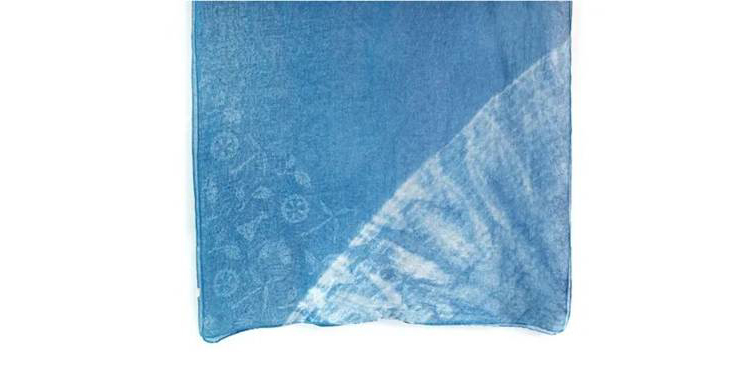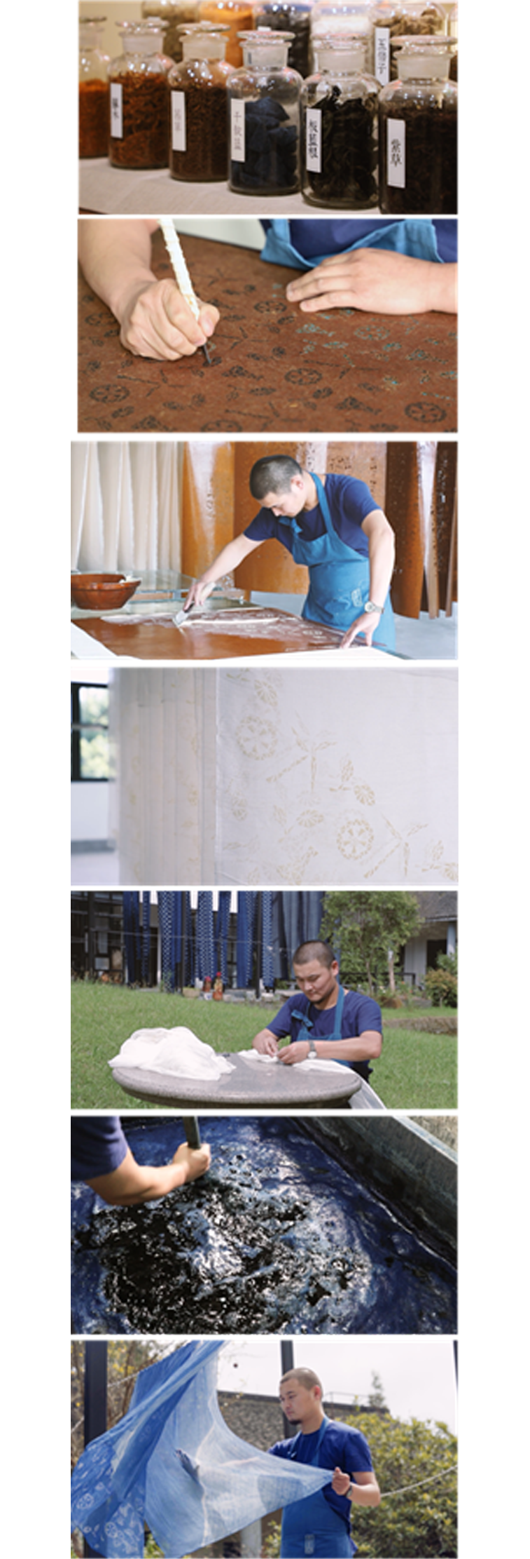 其原材料蓝靛由板蓝根、碱、石灰组合而成,水温的高低、浸染和空气氧化所加以的时间长短、载体面料的厚薄,都会带来不同的化学反应,元素间的碰撞与融合,变幻出不同深浅的蓝,一切都在不可预见中发生。