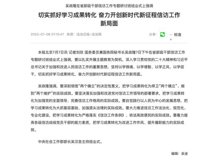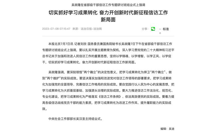 吴政隆强调,要深刻领悟“两个确立”的决定性意义,把学习成果转化为捍卫“两个确立”、做到“两个维护”的实际成效。要坚决落实加强和改进党对信访工作领导的部署要求,把学习成果转化为加强党的全面领导、完善信访工作格局的实际成效。要自觉践行以人民为中心的发展思想,把学习成果转化为大抓基层基础、加强源头治理的实际成效。要大力推进信访工作法治化、规范化、专业化建设,把学习成果转化为严格落实《信访工作条例》、依法高效便民的实际成效。要着力提高各级信访战线党员干部的能力素质,把学习成果转化为改进工作作风、提升履职能力的实际成效。
