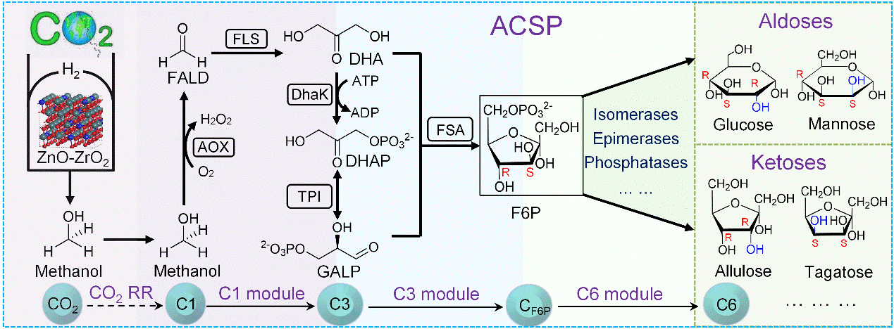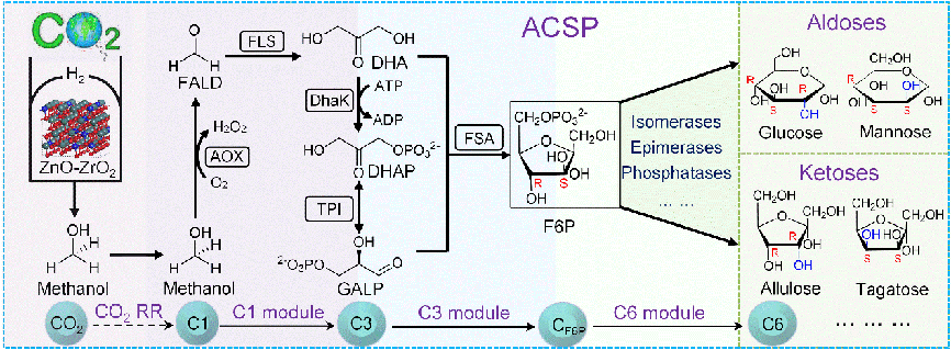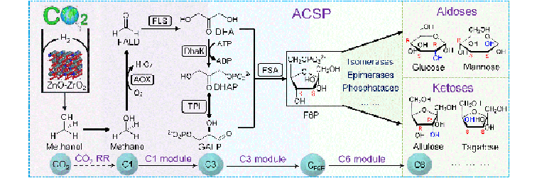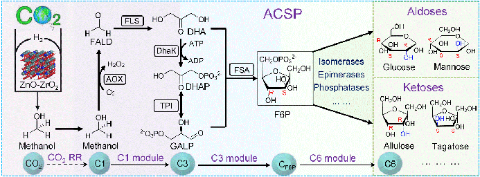中国科学院天津工业生物技术研究所功能糖与天然活性物质研究团队围绕上述问题和挑战,基于碳素缩合、异构、脱磷等酶促反应,与中国科学院大连化学物理研究所合作,建立了化学-酶级联转化二氧化碳合成己糖人工合成途径,通过酶分子改造技术提升了天然酶活性、底物特异性等催化性能,构建了碳一-碳三-碳六三个功能模块,通过模块化组装,体外实现了精准控制合成不同结构与功能的己糖,其转化率高于传统植物光合作用。同时,产物浓度和碳-糖转化速率高于已公开报道的化学法合成糖、电化学-酵母发酵耦联法合成糖等人工制糖方法。本研究所构建的糖人工合成系统可进一步耦联其他酶促生物化学反应,制备结构多样的糖分子及其衍生物。因此,研究成果建立了一种从二氧化碳、甲醇、甲醛等碳一化合物合成己糖方法,实现了较高转化效率与精准可控构型的已糖人工合成,将为从非生物质原料转化形成多样性的人工糖产物提供一种可能性。