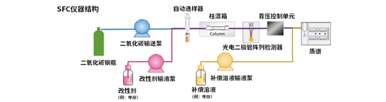 因为“我”使用超临界二氧化碳作为流动相,因此在仪器主要组成上(与传统液相色谱相比),新增了二氧化碳的输送泵和控制系统压力的背压控制单元;为了获得样品更好的分离度而引入改性剂,新增了改性剂的输送泵;以及搭配ELSD检测器、与MS联用或制备时,为了防止化合物在流路中析出而新增的补偿溶液输送泵。