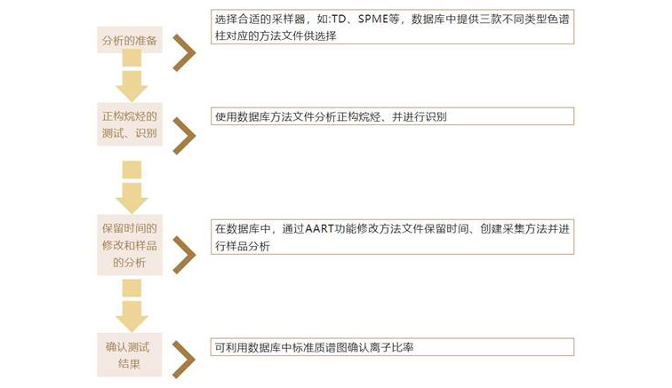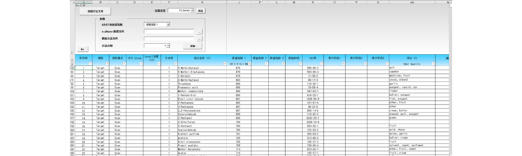 使用数据库中方法文件测定正构烷烃标准品,通过AART功能自动校正各目标化合物保留时间,建立500余种香味物质的采集方法(MRM/SIM/Scan),并可使用SPME模式对目标物进行富集后进样。