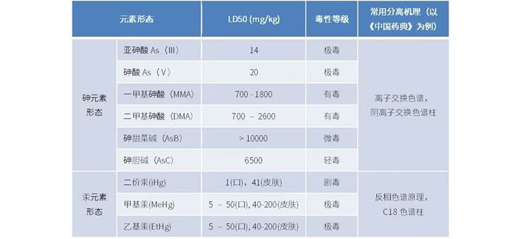 在现有的法规标准和文献资料里,无机汞、甲基汞和乙基汞由于具有比较明显的极性差异,分离方法多选用反相色谱原理为依据;6种形态砷由于具有一定的离子特性,以离子交换的方式来实现对它们的分离是常用的手段。以《中国药典2020版》第四部通则2322为例,形态汞分离选用的是C18柱,而形态砷分离选用的是阴离子交换色谱柱。