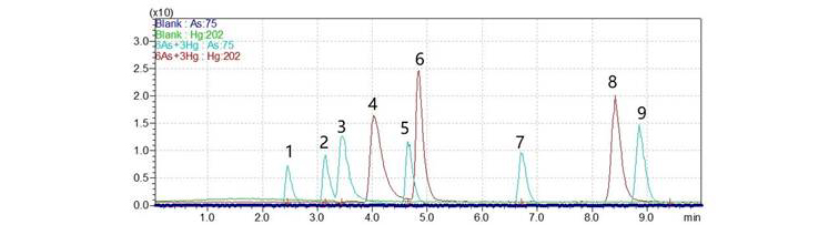 对于以上6种形态砷和3种形态汞的定量来说,HPLC-ICPMS联用是常用的分析方法,其中,LC的分离条件是关键。