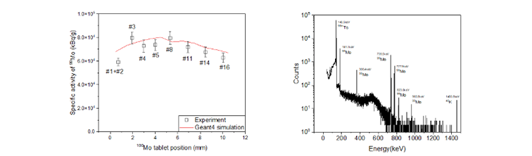 (左)钼-99产额实验值与理论值对比;(右)钼-99产品伽马能谱测量结果。近代物理研究所供图。
