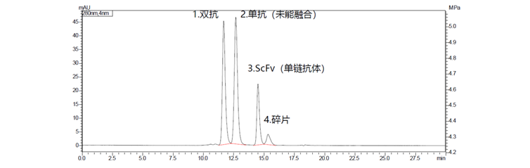 非片段化设计的双抗分子量较大,通常需要采用尺寸排阻色谱法(SEC)对其大小异质性行分析,反映双抗连接情况,保障产品质量。