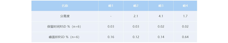 该双抗样品中各色谱峰峰形良好,分离度均大于1.5,分离良好。保留时间和峰面积的RSD %分别在0.02~0.03 %和0.12~0.64 %之间,方法重复性好。
