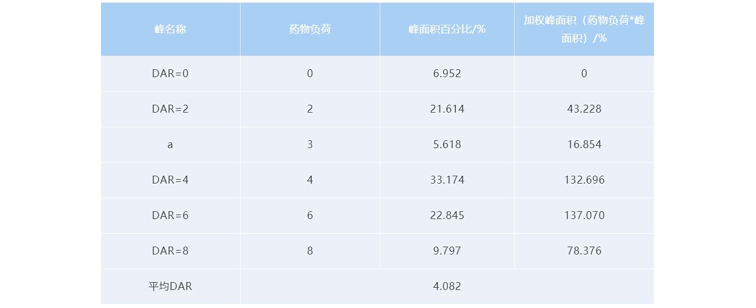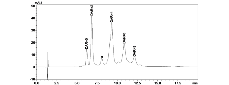 注:平均DAR=Σ(加权峰面积)/100;谱图中较小的a峰是偶联3个药物的组分。
